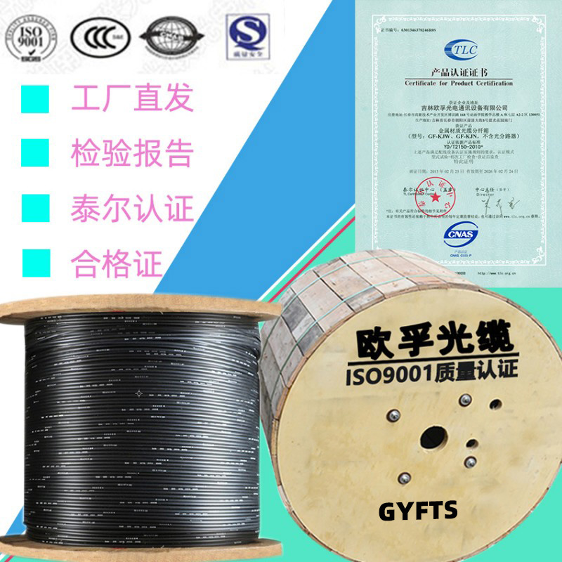 GYFTS光纜,層絞式結構,室外用、油膏填充、鋼帶縱包PE護套。采用層絞式結構,光纖套入由高模量聚酯材料制成的松套管中(光纖采用烽火及長飛的A 級光纖,保證傳輸性能優良結構性能穩定)套管內填充防水化合物。松套管 (和填充繩)圍繞非金屬中心加強芯(FRP)絞合成緊湊的纜芯,纜芯內的縫隙充以水油膏。纜芯外擠制PE護套。